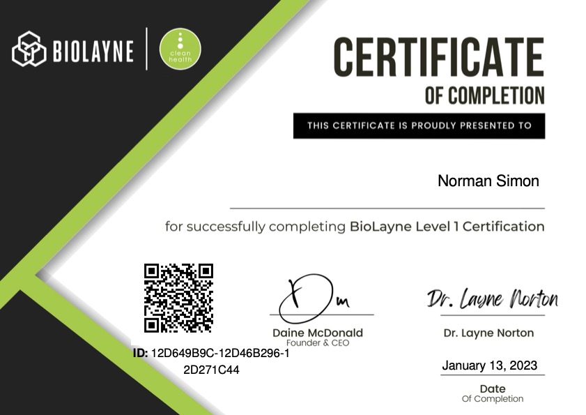 Complemento mi formación con la BioLayne Nutrition Certification, un programa creado por el Dr. Layne Norton, referente mundial en nutrición deportiva y fisiología. Esta certificación, avalada por Clean Health, se centra en nutrición aplicada, pérdida de grasa, desarrollo muscular y mejora del rendimiento, siempre desde un enfoque científico y basado en evidencia real.