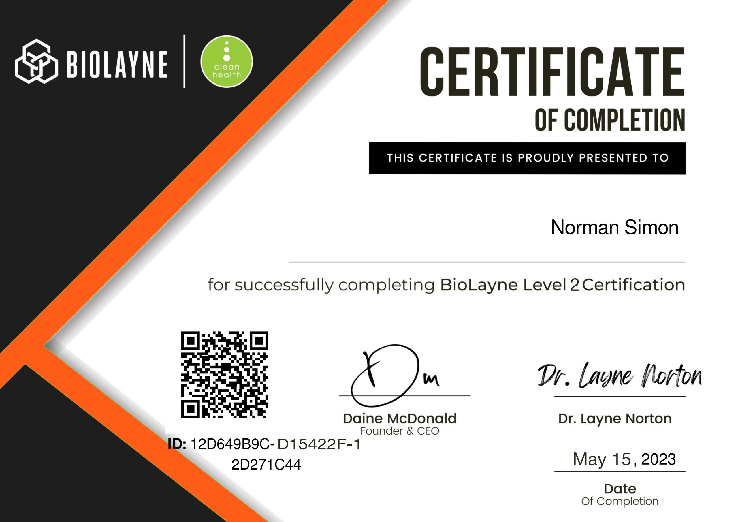 Estoy certificado como Performance Nutrition Coach (Nivel 2) por BioLayne & Clean Health, un programa creado por el Dr. Layne Norton, referente mundial en nutrición deportiva y fisiología. Esta certificación avanzada me permite aplicar estrategias de nutrición basadas en evidencia científica para optimizar el rendimiento, la composición corporal y la salud a largo plazo.